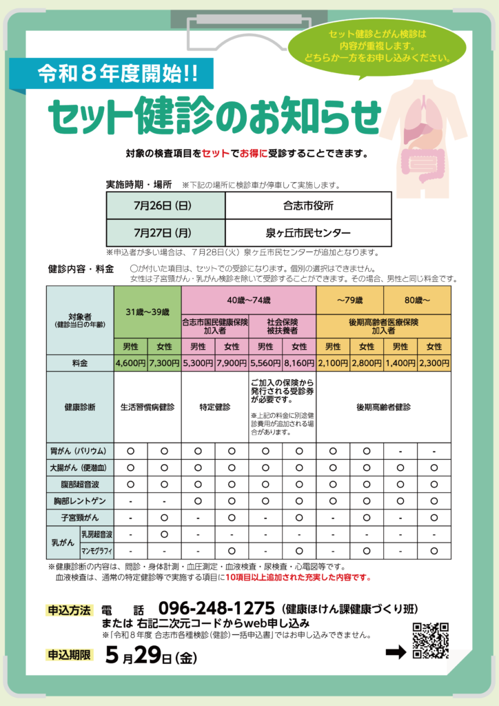 2026.04.09 令和8年度開始!!合志市セット健診のお知らせ お知らせ 令和8年度に新しく始まる“合志市住民セット健診”♪ ただいま申込み受付中です! 対象の検査項目がセットになっていますので、何度も健診に行かなくても1日で受けることができます。 血液検査は、通常の特定健診等で実施する項目に10項目以上追加した充実の内容です。 しかも、お得な料金で受診できます。 大切な身体の健康を守るため、この機会にぜひお申込みください!